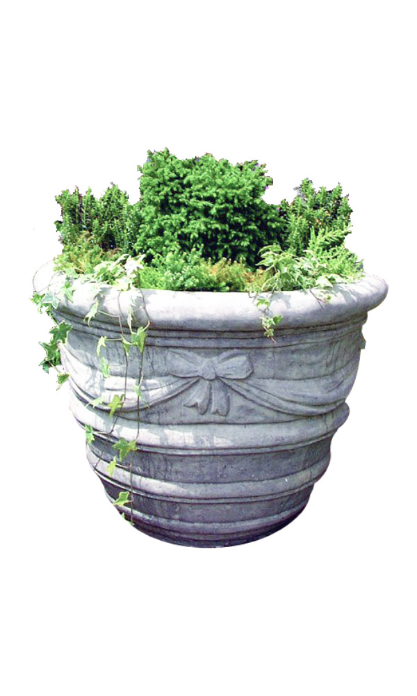 Embellish your garden with this Large Draped Stone Vase featuring a ribbon and drape decoration on the front, a moulding design around the bowl, a round top and base, and three lion feet (not shown in the pictures). A beautiful Aged Cotswold Stone or Burnt Umber finish.